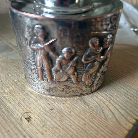 Tror det er sølvplett, finner ikke stempel, men ser ut som sølvplett. Veldig sjelden og vakkert .Pent behold. Pakker veldig godt med sending.