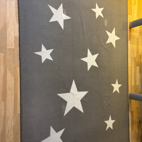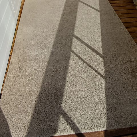 Det er et lite område som er noe mørkere (se bilde). Det kan muligens fjernes med en tepperenser. Utover det er teppet helt fint.
