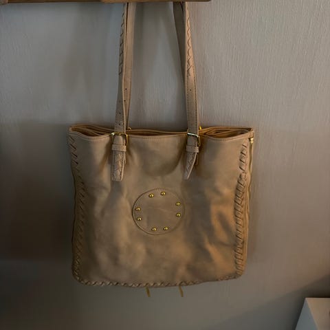 Nett i 100% ( krokodilleligndnde kvalitet), henger i mørke brunt, størrelse ca 46 cm langt og ca 43 cm bredt, har lomme med glidelås innvendig. Brukt en gang og fremstår som nytt. Selges kr 600,-