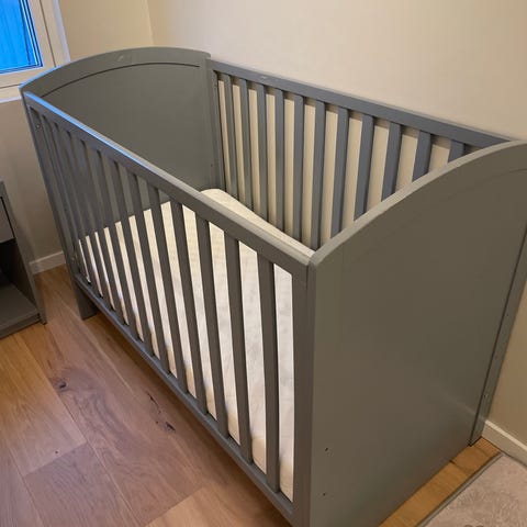 Jollyroom sprinkelseng med madrass i hvit farge. Klassisk sprinkelseng med sengebunn i trelameller. Passer standard madrass til sprinkelseng. Egnet for spedbarn og små barn. Sengen har synlige bruksspor på kanter og overflater, som vist på bildene.