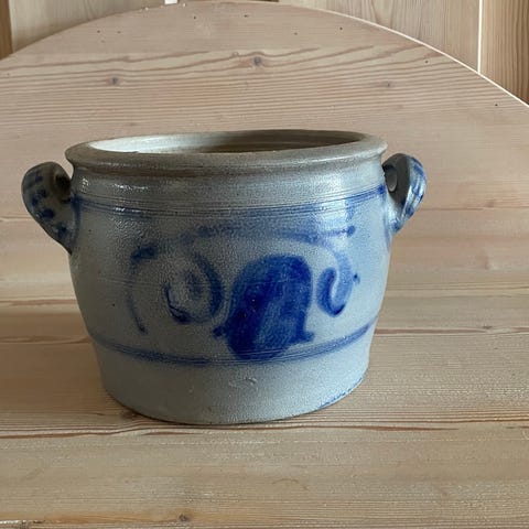 Perfekt som dekor, oppbevaring eller til rustikk kjøkkenbruk. God stand. Liten sprekk på innsiden ved det ene håndtakfestet (ikke synlig utvendig). Stabil og solid.