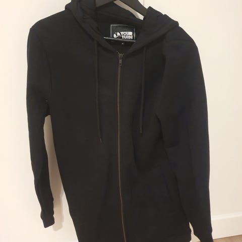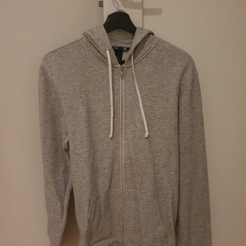 Hettejakke for herre i størrelse M. Jakken er grå med hel glidelås i front og hette. Den har sidelommer med mørke detaljer. Passer som hverdagsplagg eller lett ytterlag i mildt vær.