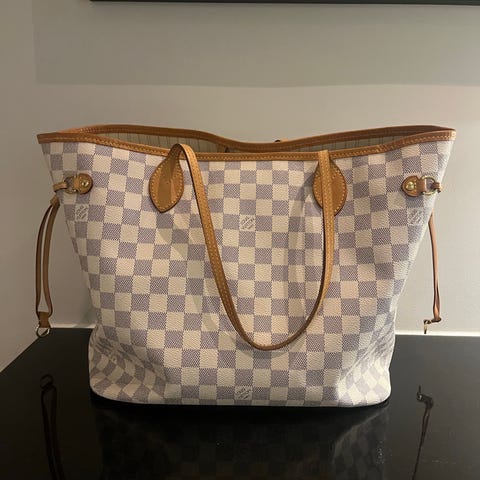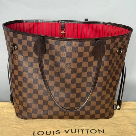 Louis Vuitton Neverfull veske i brun lær for dame. Vesken har det karakteristiske rutete Damier-mønsteret utvendig og rødt stripet fôr innvendig. Den leveres med avtakbar clutch/innerveske i samme mønster. Hovedrommet er åpent med én innvendig glidelåslomme og sideløkker for feste av clutch. Lange skulderstropper gjør at vesken kan bæres på skulderen eller i hånden. Egnet som hverdagsveske eller shopper med god plass til personlige eiendeler.