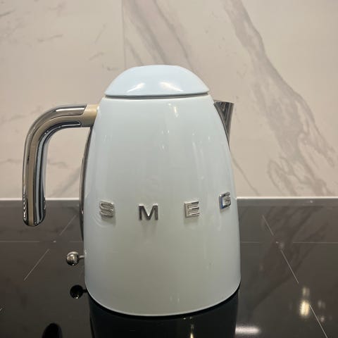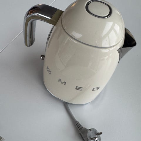 Smeg vannkoker i svart farge. Elektrisk vannkoker med håndtak i metall og tydelig Smeg-logo på siden. Passer til koking av vann til te, kaffe og annen drikke på kjøkkenet.