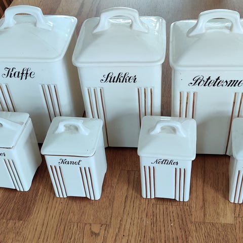 Settet består av 4 store og 4 små krydder sett pluss en vegg hengt mel boks med tre lokk