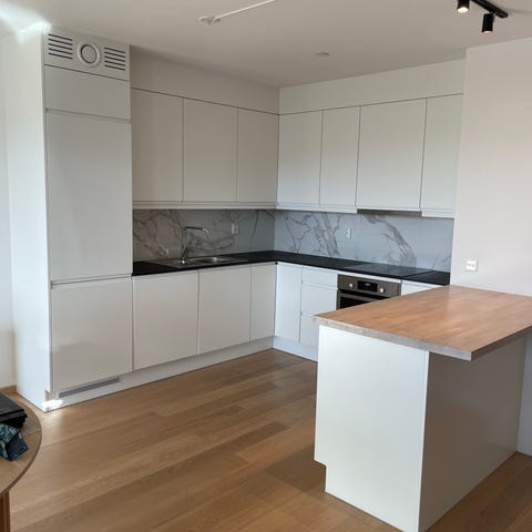 Hvitevarer: Oppvaskmaskin fra LOGIK, integrert helkjøleskap fra AEG, integrert ovn fra AEG, platetopp fra AEG og integrert mikrobølgeovn fra AEG.