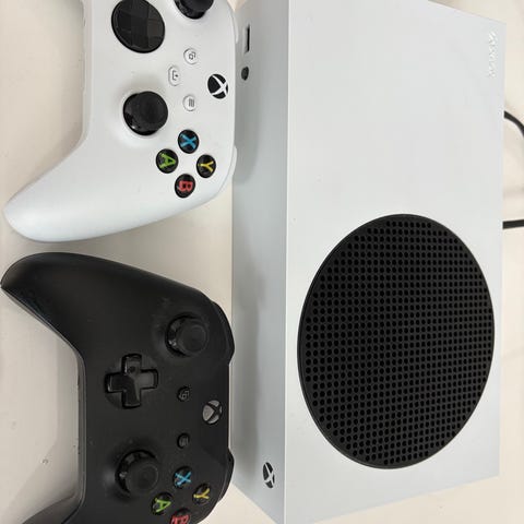 Selger ein Xbox Series S, som er inkludert dei kontrollerane som vises på biletet. Har hatt dei i ei lita stund no, men så vidt brukt. Sjølve spillkonsollen har 512 GB. Prisen setter eg på 2500kr