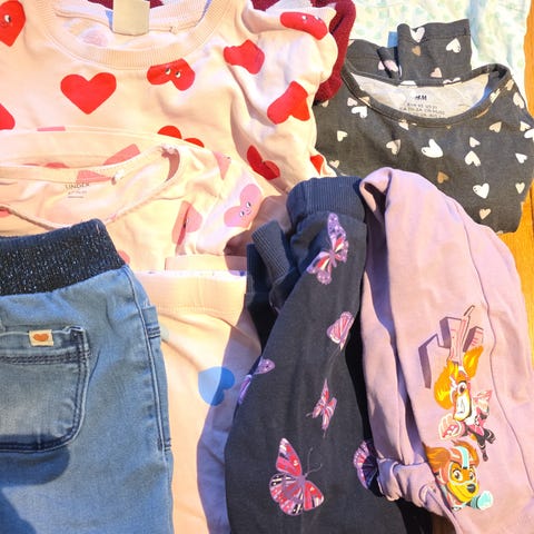 5 kjoler - rosa glitterkjole H&M, blå sommerkjole Cubus, lyseblå tyllkjole (ubrukt) POMPdeLUX, brun ullkjole (merinoull) Name It og mørkeblå paljettkjole Zara Girls.