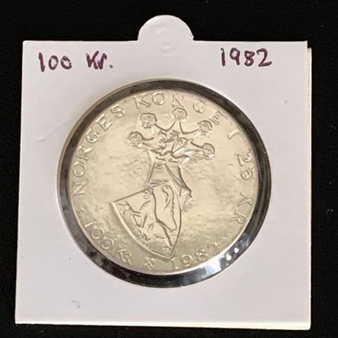 Norges Konge 25 år 100 kroner 1982 minnemynt i sølvfarget metall. Mynten har portrett på advers og norsk riksvåpen med tekst «NORGES KONGE 25 ÅR» og årstall 1982 på revers. Egnet som samleobjekt for mynter og numismatikk.