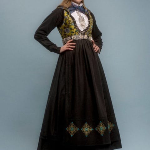 Brokaden i vest og på forkle gir drakten et staselig preg.