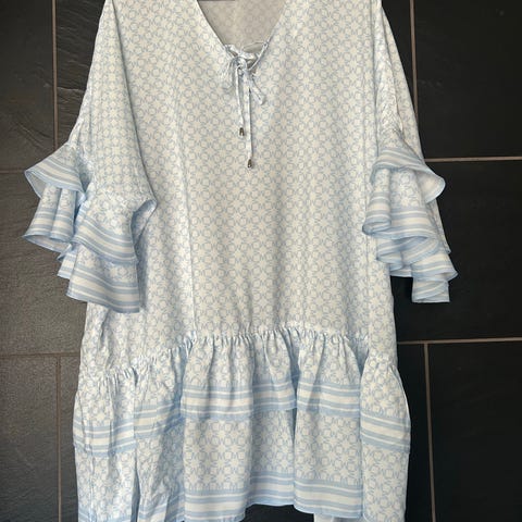 By Malina sommerkjole i sateng for dame i størrelse M. Kjolen har flerfarget blomstermønster med lyse pastelltoner. Modellen har lange, vide ermer og rund hals. Det er rynkedetaljer og åpning foran på brystet, samt glidelås i ryggen.