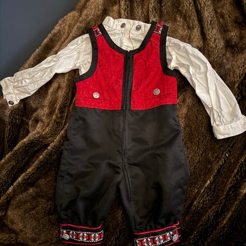 Komplett festdrakt til gutt str. 86 cm. Superpraktisk heldrakt med glidelås for enkel påkledning/bleieskift😍 Skjortebodyen har noe veldig svak misfarging ved halsen, lite synlig.