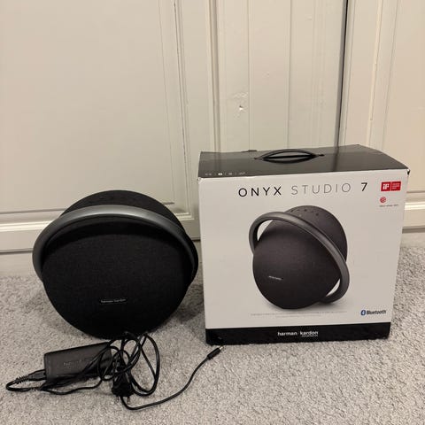 Høyttaleren har et rundt design med integrert bærehåndtak. Den leveres med strømadapter/kabel som vist på bildene. Enheten er egnet for trådløs musikkavspilling fra kompatible enheter og kan brukes både hjemme og på farten.
