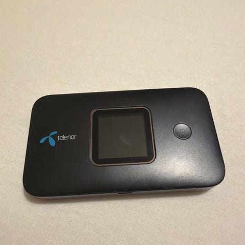 Telenor mobilt bredbåndsmodem i svart farge. Enheten har innebygd skjerm på fronten for visning av statusinformasjon og en av/på-knapp ved siden av skjermen. Modemet er beregnet for trådløs tilkobling til internett via mobilnett og kan brukes som bærbar ruter for flere enheter samtidig. Egnet for bruk hjemme, på reise eller som midlertidig internettløsning der fast bredbånd ikke er tilgjengelig.