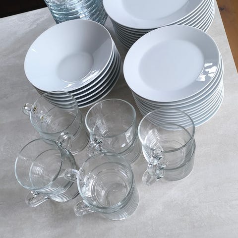 Startpakke; servise med tallerkener, asjetter og glass