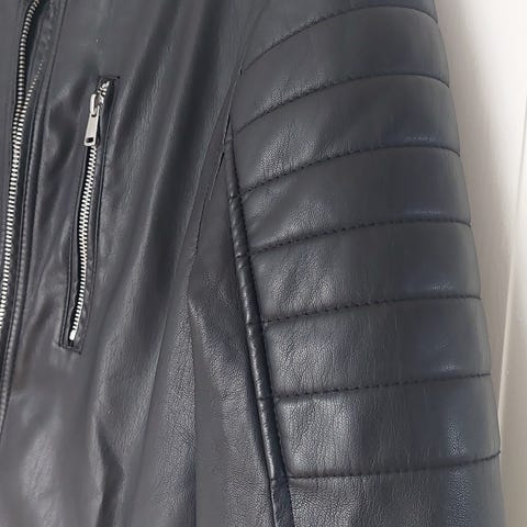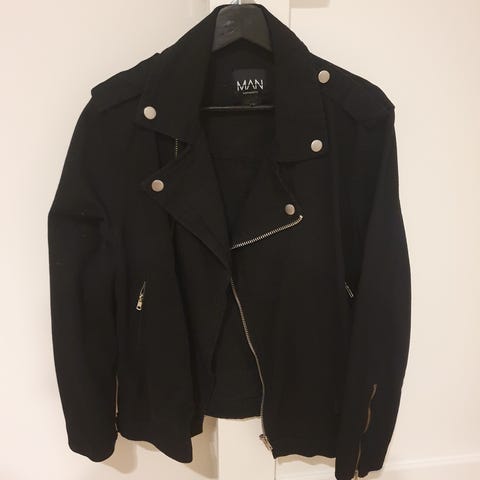 H&M jakke for herre i størrelse L. Jakken er svart og har glidelåslukking foran samt flere glidelåslommer. Designet har en klassisk bikerstil med krage og detaljer i metall. Passer som ytterplagg i overgangssesonger eller milde dager.