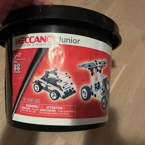 Meccano byggesett rallybil og stuntfly. Settene består av deler i metall og plast som skrus sammen med medfølgende verktøy. Rallybil-settet kan brukes til å bygge ulike bilmodeller, mens stuntfly-settet er et 2-i-1-sett der man kan bygge flere flyvarianter. Passer for barn fra ca. 8 år og oppover, avhengig av erfaring med byggesett.