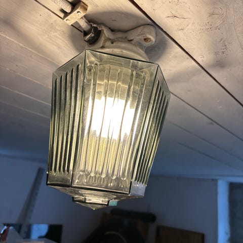 Antikke art deco Glasskupler lampeskjerm i glasd til taklampe i beige marmorert utførelse. Settet består av fire runde kupler med sentralt hull for montering på lampeoppheng. Kuplene har avrundet form med dekor i brune og grå nyanser som gir et marmorert preg. Egnet som reservedeler eller utskiftbare skjermer til taklamper med tilsvarende festeordning. Kuplene er laget i glass og har riflet kant på utsiden nær åpningen. Størrelse og nøyaktig mål er ikke oppgitt og bør kontrolleres mot eksisterende lampeoppheng før bruk.