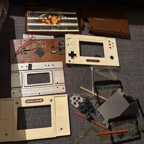 Settet består av flere plastdeler til ytre kabinett for håndholdt Game & Watch-enhet, inkludert topp- og bunnskall, frontpanel med knappesymboler og utsparinger for skjerm og kontroller. Delene er i oransje plast og er beregnet som erstatningsdeler til originalt Donkey Kong Game & Watch-kabinett. Egnet for reparasjon eller restaurering av kompatibel enhet der originalt kabinett er skadet eller mangler.