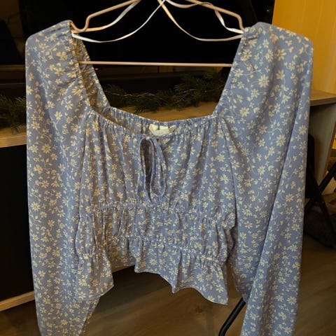 Selger bluse fra Missguided, er i størrelse 38, men vil si det er nærmere 36. Peplum fasong med stikk rundt livet og mansjetter, samt snøring fremme. Kun prøvd.