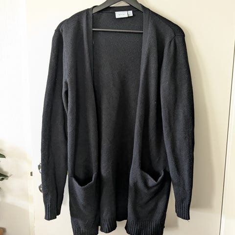 Vila cardigan for dame i størrelse M. Åpen modell uten knapper i ensfarget grå. Strikket materiale med hovedandel viskose, blandet med nylon og polyester for form og holdbarhet. Ribbestrikkede kanter nederst og på ermene. Passer som lett ytterlag over topp eller skjorte til hverdagsbruk.