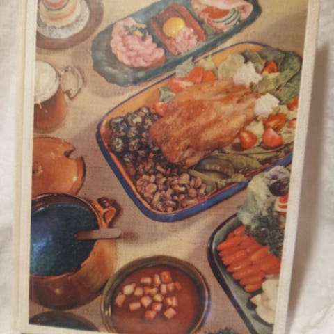 Tykk vintage kokebok med masse oppskrifter og fine bilder i både sort-hvitt og i farger.