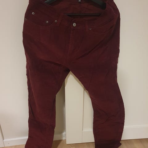 Chinos bukse for herre i rød farge i størrelse M. Buksen har klassisk chinos-snitt med sidelommer og beltehemper. Passer til hverdagsbruk og mer formelle anledninger, avhengig av hva den kombineres med. Materiale er ikke oppgitt.