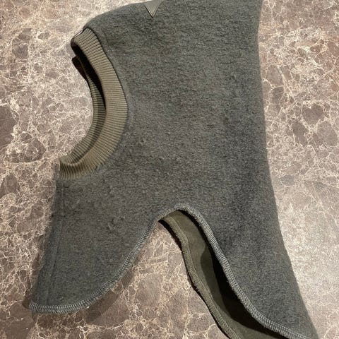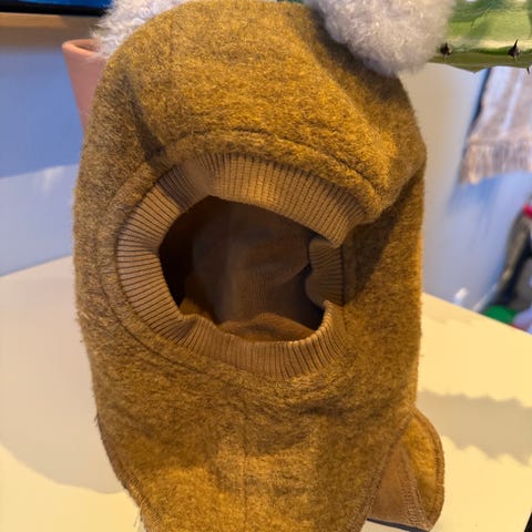 Pent brukt balaclava. Yttermaterialet er i ull, med mykt velour fôr på innsiden. Modellen har to dusker i pels på toppen.