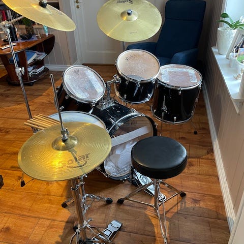 Gear4music trommesett i svart utførelse, med krakk og trommestikker