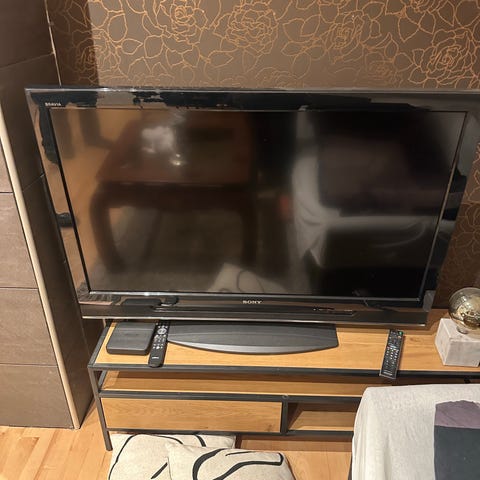 Tv fra LG gis bort! Den er 85 eller 86 tommer. Barna har dessverre kasta en liten kule i skjermen, og det har blitt sånn striper som man kan se på bildet. Den er allikevel ok brukbar sånn som den er, jeg har hatt den sånn lenge. Men vi har flyttet, og nå har jeg uansett ikke plass til den i stua her. Aller helst skulle den jo ha vært fikset, men det er ganske dyrt, så det måtte isåfall ha vært av noen som kan sånt. Følger med fjernkontroll.
