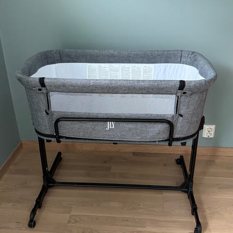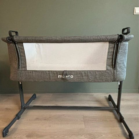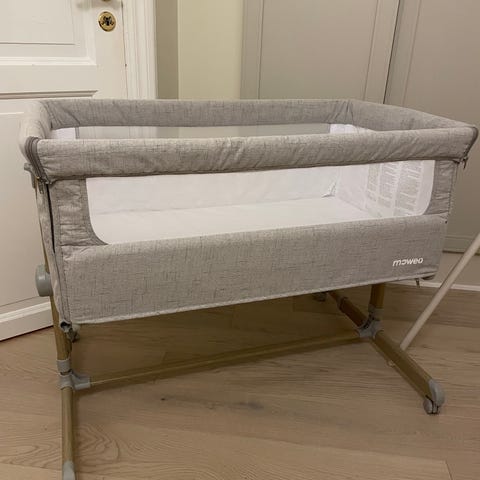 Moweo bedside crib i grå tekstil. Ingen synlige merker.