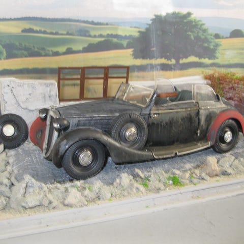 Modellbil diorama med cabriolet bilvrak og menneskefigur på base. Bilen er plassert på en oppbygget sokkel med gress- og grusdetaljer, og har åpne dører, synlig motorrom og røyk-/skyeffekt. Interiøret er detaljert med seter og dashbord, og det følger med en figur som står ved bilen. Dioramaet viser en slitt klassisk bil og kan brukes som utstillingsmodell eller som del av en større modelljernbane- eller samlerscene.