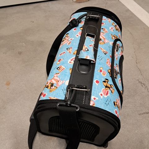 Camon bæretaske til kjæledyr med leopardmønster og røde rose-detaljer. Vesken har to bærehåndtak og glidelåslukking på toppen. Det er nettingfelt på sidene for ventilasjon og en ytterlomme med glidelås på fronten. Innsiden er lys og har feste for sele eller halsbånd. Egnet for transport av små hunder eller katter.