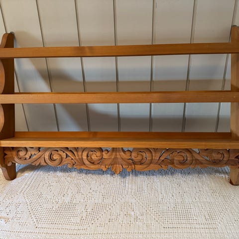 Jugend eik tallerken hylle med 2 hyller utfreste spor på øverste hylle for at tallerkener skal stå. Ligger ute for salg en noe tilsvarende hylle til 4300,- Selges hbo 3500.-