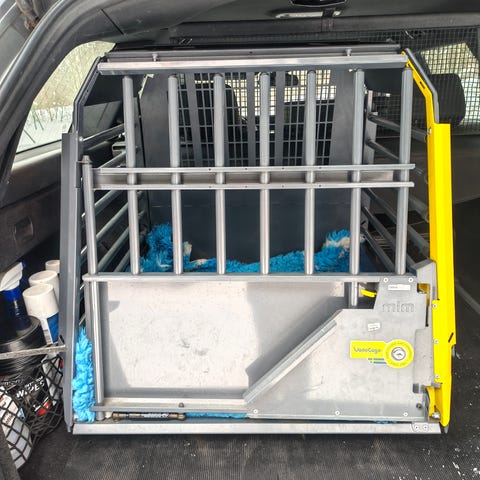 Buret er konstruert for bruk i bil og er crash-testet, som angitt på merking. Det har solide gittervegger og justerbare stenger i metall. Døren har låsemekanisme og gule betjeningshåndtak. Bunnen er i metall med spor for justering og festepunkter.