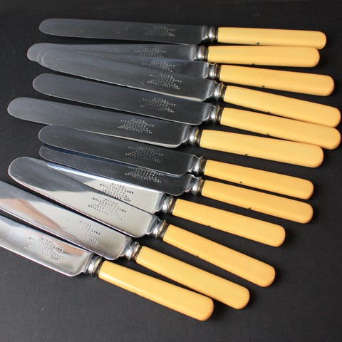 Komplett sett med 6 kniver fra Rolf Brynhildsen, Oslo. Rustfrie blad med originale bakelittskaft i klassisk 50-talls design. God stand, ingen sprekker i skaftene. ideellt for retro bestikk-samler eller bruk i hjemmet.