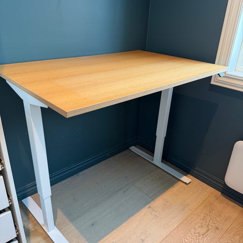 Skrivebord med hev/senk og bordplate i eike laminat fra 2025.