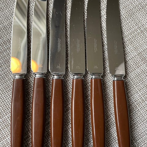 Knivene har orginale skaft i ekte bakelitt i klassisk lys honningfarge. Bladene er merket " Warranted Sheffield England" og "Rustfri", produsert for det skandinaviske markedet ca. 1940-1950-tallet.
