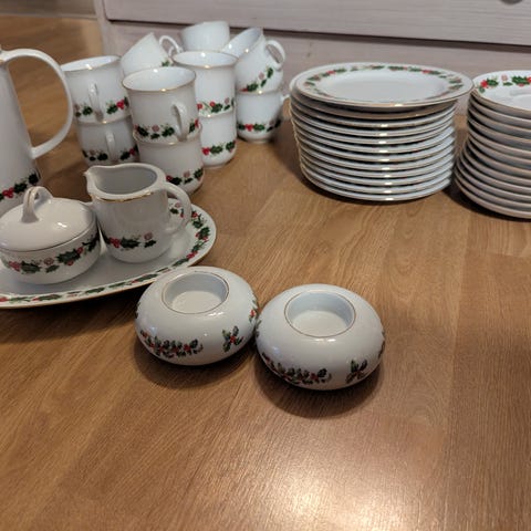 Christmas Party kaffeservise i porselen. Serviset har rød bunnfarge med hvite prikker og motiv av juletre og stjerner. Består av kopper med tilhørende asjetter og tallerkener i samme dekor. Egnet som juleservise til servering av kaffe, te, kaker og andre varme drikker med tilbehør. Designet er merket "Christmas Party" på undersiden. Selges pga flytting. Ikke brukt. Kunn stått i skuffen ubrukt.