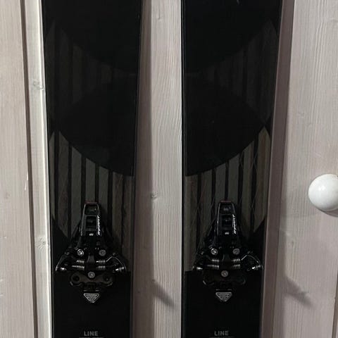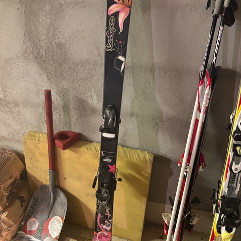 . Skiene har fargerikt design i svart, rosa og grønt på oversiden og mørk såle. Leveres med monterte twintip-bindinger og ski bag. Skiene er 155cm er 177selv og funker fint. Lettere og stå på kortere ski, og gøy og leke seg meg i bakken