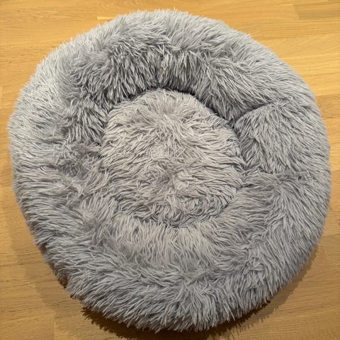 Rund seng . Som en hule i mykt, langhåret stoff. Sengen har rosa utside og hvit innside. Undersiden er mørk med antiskli-prikker. Egnet for mindre hunder eller katter som liker å ligge mykt og omsluttet. Kan plasseres på gulv eller i et rolig hjørne av rommet.