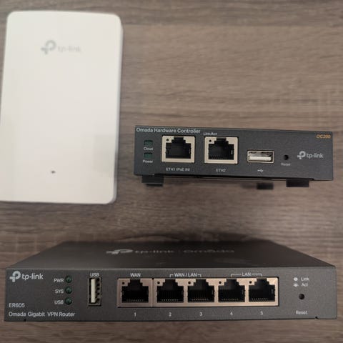 En switch er ikke med på bildet, pga fremdeles montert i rack på loftet. ( FortiSwitch 124E-FPOE )