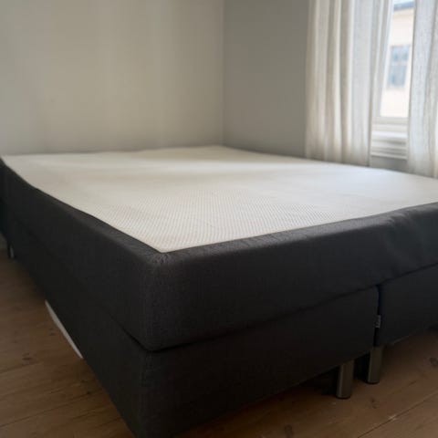 Jensen kontinentalseng 150x200 med mørkegrå tekstilramme i god stand. Fantastisk seng å sove i!