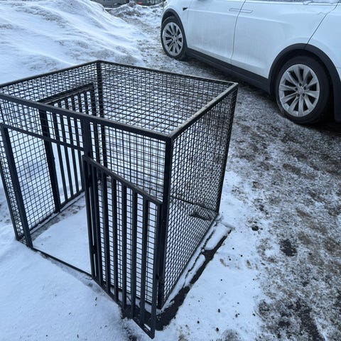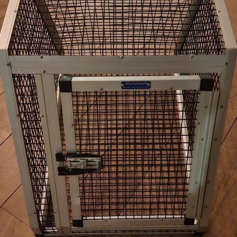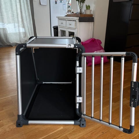 Ubrukt lett aluminiumsbur til bilen med praktiske mål og fasong. Selges fordi det var for lite for vår retriever. Størrelse M. Mål: H:62, B:55, D:75 (bunn), skråner mot topp slik at plassen utnyttes og får plass også med skrå bakluke. Merke Canem.