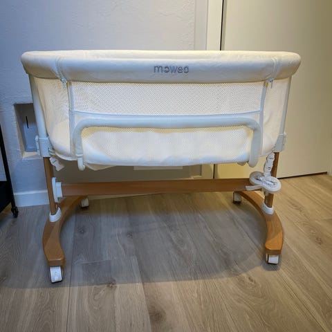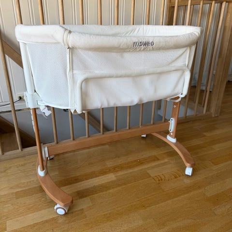 Moweo bedside crib babyseng i grå tekstil med hvit innside. Sengen har justerbar høyde og solid metallstativ med støtteben. Sidene har nettingfelt som gir lufting og innsyn til barnet. Egnet som babyseng ved siden av voksenseng for spedbarn i de første månedene. Stofftrekket kan åpnes med glidelås på siden for enkel tilgang. Passer til standard madrass for bedside crib (madrassmål kan kontrolleres mot produsentens spesifikasjoner).