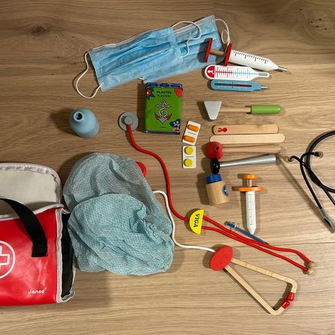 Doktorsett leke med legefrakk og tilbehør. Settet inneholder blant annet hvit legefrakk med turkise detaljer, legekoffert og ulike legeinstrumenter i plast som stetoskop, sprøyte, termometer og annet utstyr. Kofferten er litt ødelagt og kan følge med om ønskelig.