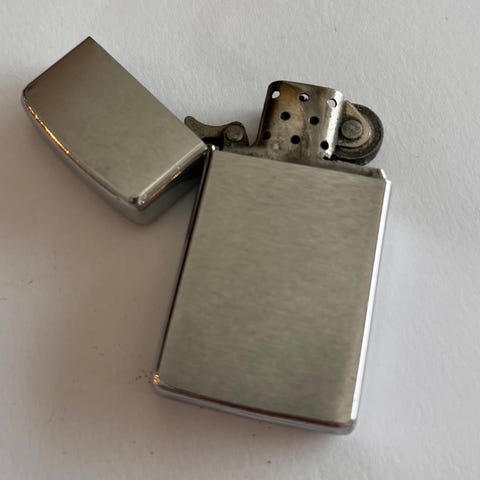 Zippo Iridiscent, en veldig fin farge som varierer mellom blått, grønt og lilla. Zippoen trenger en ny flint.