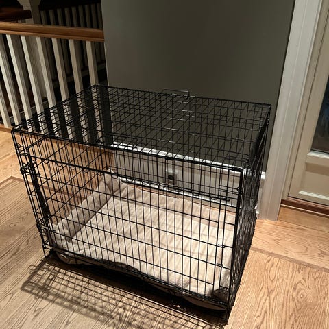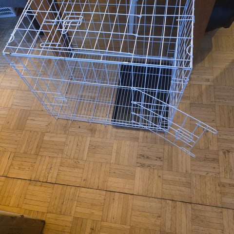 Det har vært et kennel bur for mattilsynet en gang i tiden, har fungert utmerket så langt. Men egentlig alt for stort til hunden vi har nå.