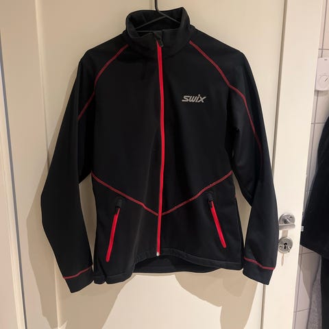 Swix løpejakke / langrennsanlegg for dame i størrelse S. Jakken er svart og har hel glidelås i front. Den har høy krage, formsydd passform og lange ermer med mansjetter. Det er glidelåslommer i sidene og justerbar nederkant med stramming. Egnet til løping og annen utendørs trening.