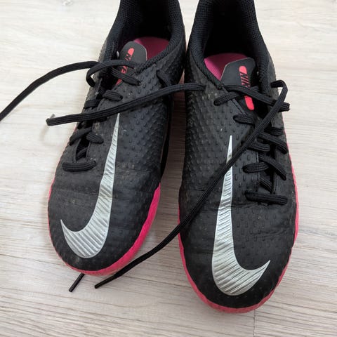 Nike fotballsko i lav modell. Skoene har overdel i syntetisk materiale i hvit med svarte og røde detaljer, inkludert Nike-logo på siden. Yttersålen er rød og svart med mønster som gir godt grep på underlaget. Lissesnøring for justerbar passform. Passer til barn eller ungdom til bruk på bane eller fritid, avhengig av størrelse og underlagstype.